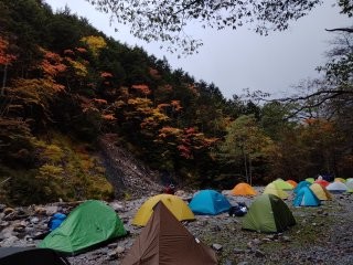 雨の日には、濡れた装具をテント内に吊り下げ、床もじわじわと湿ってきます。